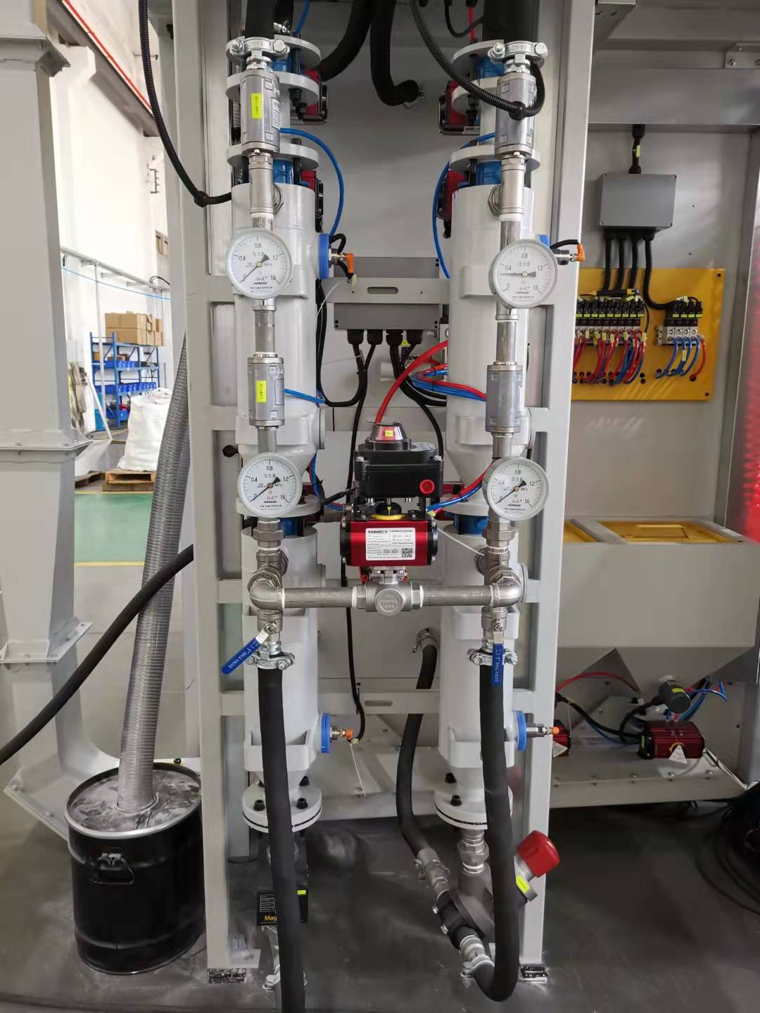 7)噴丸發生單元采用2套G15航空等級雙層連續噴丸罐,噴丸壓力由意大利METALWORK電氣比例閥進行